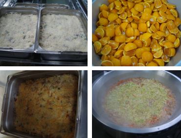 「押麦のグラタン 豚肉と野菜のスープ デコポン 牛乳」