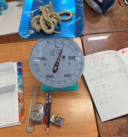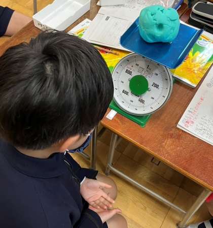 「ものと重さ」の学習を進めています。今日は、粘土を様々な形に変えて重さを量る活動を行いました。「物は形が変わっても重さが変わらないこと」を、体験を通して学ぶことができました。とても興味深そうな顔で目盛りを覗き込んでいました。