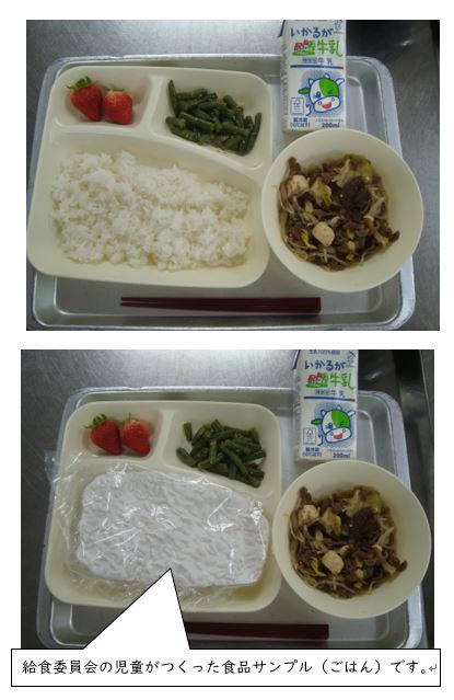 「すき焼き煮 さんどまめごまあえ いちご ごはん 牛乳」