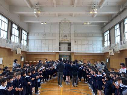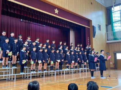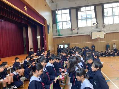 続いて、在校生から6年生のみんなへメッセージカードを、6年生からは手作りのぞうきんをプレゼントしました。全校児童の心が1つにまとまった感動的なお別れ集会となりました。6年生は卒業まで11日です。1日1日を大切に、さらに小学校生活を充実させていってほしいと思います。