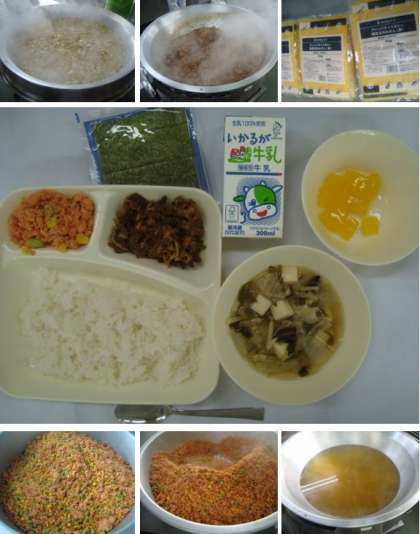 「手巻きご飯(牛肉のコチジャンいため、さけのカラフルそぼろ 焼きのり)すまし汁 ダイスゼリー(みかん)牛乳」