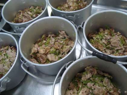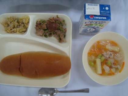 「豚肉のガーリック焼き、スープ、ツナとキャベツのソテー 黒糖パン 牛乳」