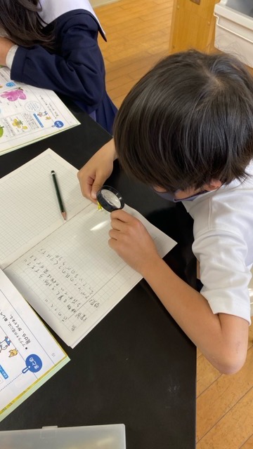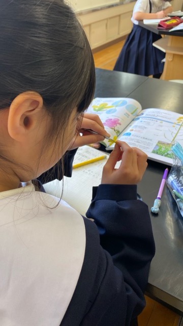 5年生は、理科の授業でアブラナの花のがくや花びらを外しながら、花の各部分のつくりを観察しました。