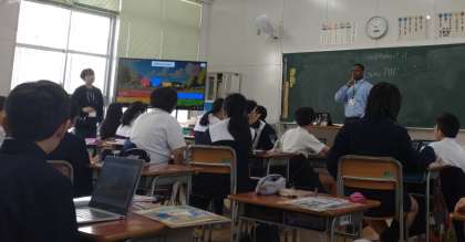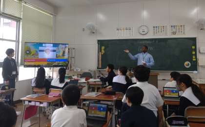 6年生の外国語では、英語専科の先生とC-NETの先生とがタッグを組んで、授業をおこなっています。今日の授業では、「Who is this?」「Who are they?」などの質問に合うものを、パソコンを使って選んで答えました。クイズをしながら楽しく英語の学習を進めています。