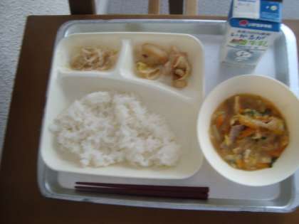 「焼きとり みそ汁 もやしのゆずの香あえ ごはん 牛乳」