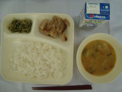 「豚肉のしょうが焼き とうふのみそ汁 じゃこピーマン ごはん 牛乳」