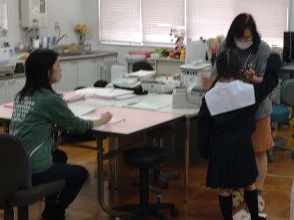 今日は低学年の聴力検査の日です。音が聞こえたら、手をあげて合図を出します。友達の検査の間も、静かに待つことができていました。