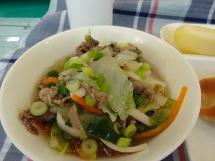 肉うどんには、牛肉、かまぼこ、白菜、にんじん、青ネギが入っていて、おだしもきいていて、とても美味しかったです。