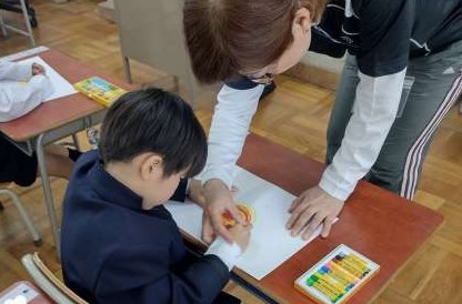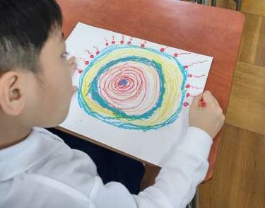 毎日元気いっぱいの1年生が、図画工作の時間に「たいよう」の絵を描きました。「太陽はどんな色かな?」と自分のイメージを膨らませ、色を決めたらパスで描き始めます。「ふわふわぬり」「ごしごしぬり」等、ぬり方も工夫して、カラフルで元気いっぱいの太陽の絵が描けました。