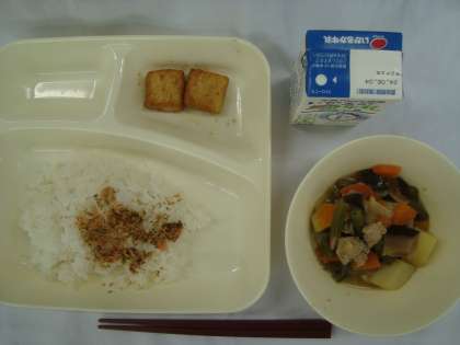 「鶏肉とじゃがいもの煮もの あつあげのしょうゆだれかけ 紅さけそぼろ ごはん 牛乳」