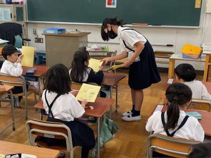 1年生の教室です。ハンカチ・はなかみを持っているか、つめはきちんと切っているか、朝晩のはみがきができているか等の「せいけつしらべ」をおこなっています。健康委員会の高学年児童が、やさしくていねいにサポートしてくれています。