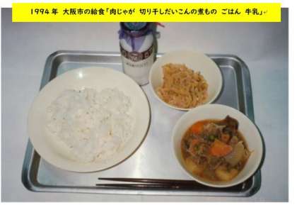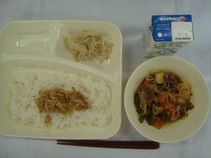 「みそ肉じゃが もやしの甘酢あえ ごまかかいため ごはん 牛乳」