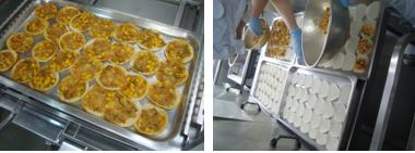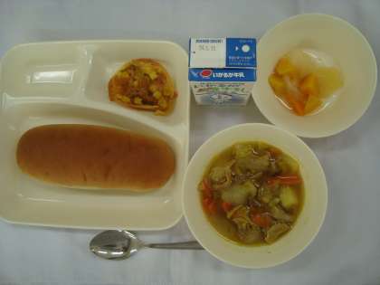 「豚肉と野菜のカレースープ煮 変わりピザ ミックスフルーツかんづめ 黒糖パン 牛乳」