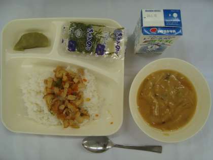 「かやくご飯 きざみのり みそ汁 まっ茶ういろう 牛乳」