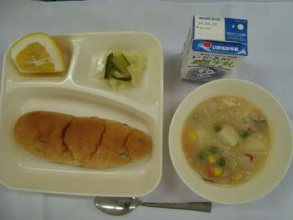 「鶏肉のコーンシチュー キャベツときゅうりのサラダ かわちぱんかん レーズンパン 牛乳」