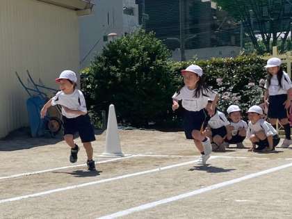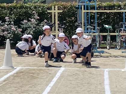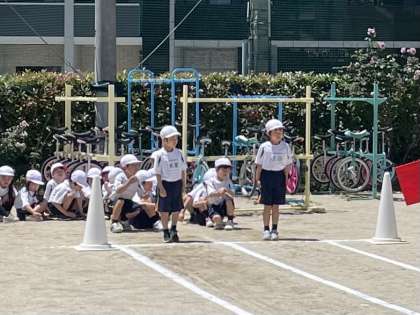 1年生の体育の時間です。50m走のタイムを計測しています。みんなドキドキのスタートです。