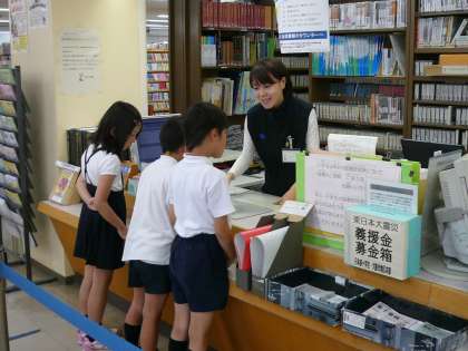 1階はコミュニティセンターで区民の人たちが使えるホールや会議室があります。2階の読書ルームで図書館司書の先生から紙芝居を使っての説明がありました。この部屋はエアコンが入っていたので涼しくいい気持でした。質問もみんなたくさんしました。