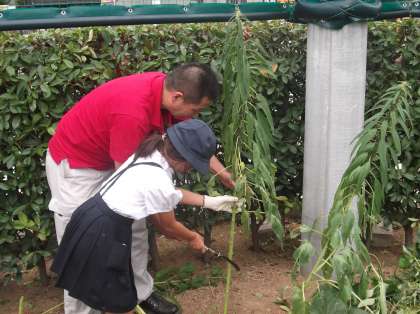 以前、町たんけんでお世話になった和田萬さんと6月の下旬にゴマを植えましたが、大きく成長し、本日、刈り取りを行いました。