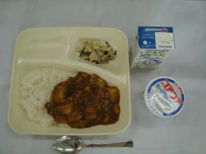 「牛肉と大豆のカレーライス キャベツのひじきドレッシング ヨーグルト 牛乳」