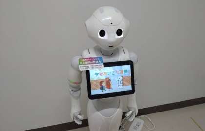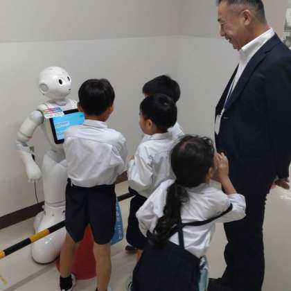 2階の廊下で西天満小学校の子どもたちをやさしく見守っているペッパー君。新たに会話AI機能が搭載され、今まで以上にたくさんお話ができるようになりました。次はどんなお話をしようかな?