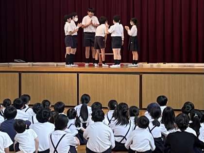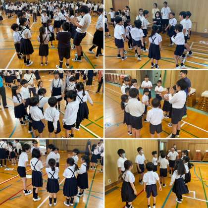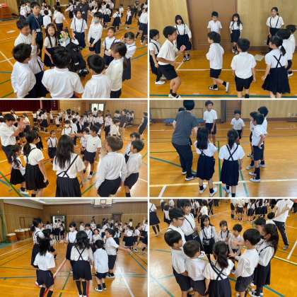 今朝の児童集会の様子です。今回のゲームは、「リーダーをさがせ!」です。リーダーの動きに合わせて、グループの他の子どもたちがまねをします。誰がリーダーかを知らないオニ役の子が円の中に入り、リーダーが誰かをさがすゲームです。なかなか見つからず、盛りあがっていました。
