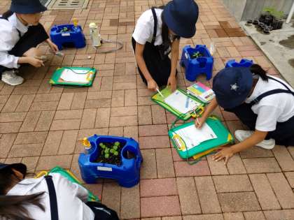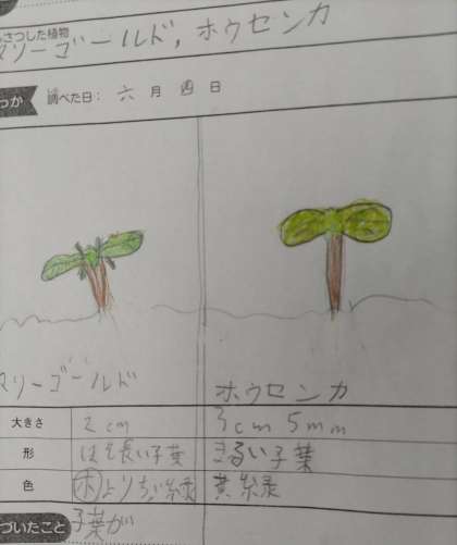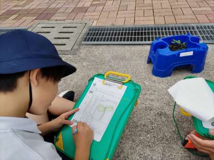 3年生が先日まいた種から、芽が出て、どんどん育ってきました。毎朝みんなが水やりをがんばっているおかげです。今日は「子葉」という言葉を学習して、じっくりと観察しました。
