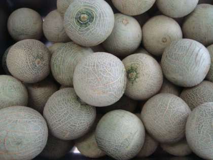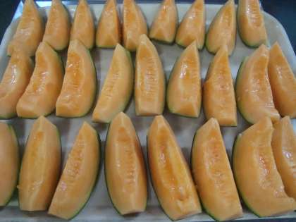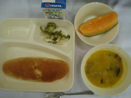 「鶏肉とかぼちゃのクリームシチュー ミックス海そうのサラダ クインシーメロン おさつパン 牛乳」