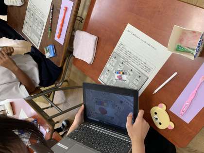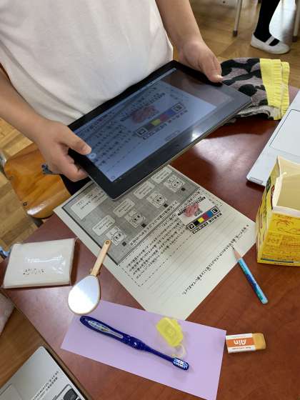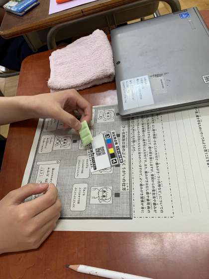 さらに、学習者用端末を活用して、咀嚼チェックも行いました。たくさん噛むと色が変わるガムを使ってしっかりと噛めているかをチェックする仕組みです。