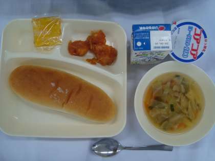 「えびのチリソース 中華スープ ヨーグルト コッぺパン みかんジャム 牛乳」