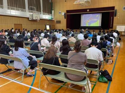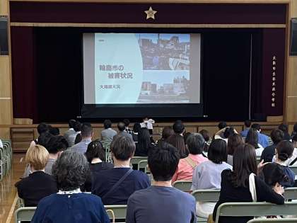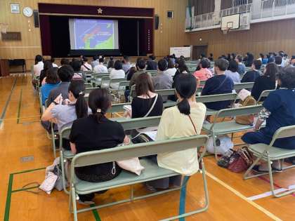 参観授業の終了後、保護者の皆様には講堂に集まっていただき、防災講演会を行いました。北区役所防災担当の方より「地域における防災について」と題して、能登半島地震の被災状況を踏まえたお話をしていただきました。