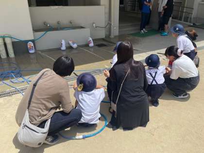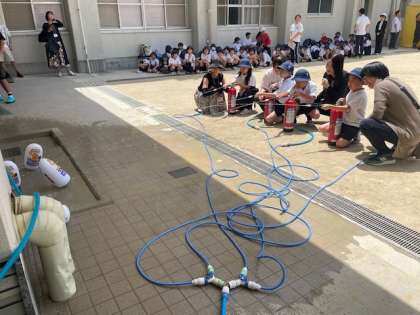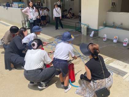 その間、子どもたちは、理科室からの出火を想定した火災避難訓練を行ったあと、地域やPTAの皆様のご協力を得て、学年ごとに防災実演訓練を行いました。1・2年生は、水消火器体験と煙体験です。