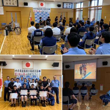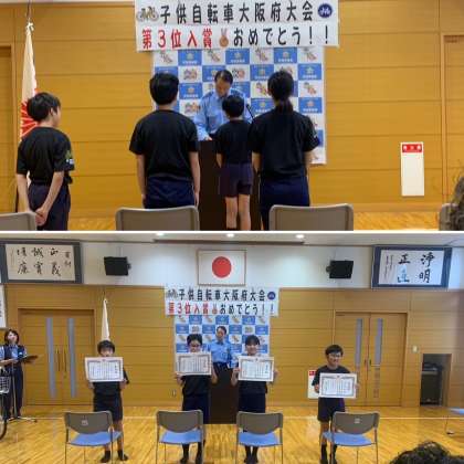 交通安全子ども自転車大阪府大会で第3位に輝いた西天満小学校チームが天満警察署で表彰式をしていただきました。盛大な表彰式、そして天満警察署長から賞状を受け取った子どもたちは、4人とも誇らしげな表情でした。今回の経験を活かし、今後も交通安全に努めてもらいたいです。