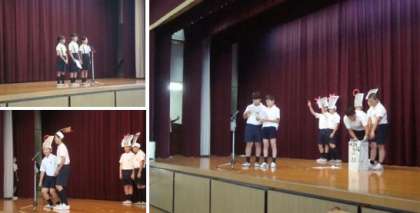 今日の児童集会では、給食委員会の子どもたちから、牛乳パックの片づけ方についてのお知らせがありました。手づくりのかぶりものを使うなどして、とても楽しく広報活動をしてくれました。