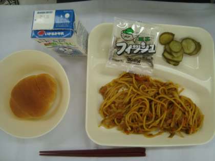 「カレースパゲッティ きゅうりのピクルス ミニフィッシュ ミニコッぺパン 牛乳」