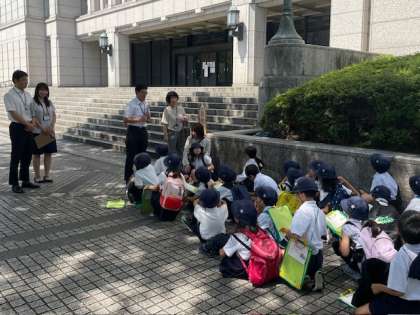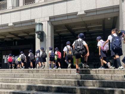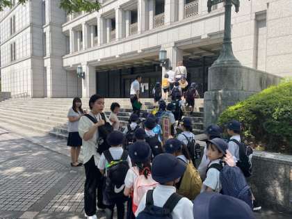 3年生の子どもたちが、社会見学で大阪市役所に行ってきました。東側玄関で市役所職員の方にお出迎えいただき、庁舎の中に入ります。