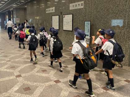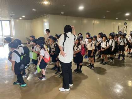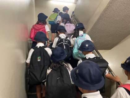 中に入ると、8階のさらに上の屋上階まで、階段を使ってのぼります。みんな息を切らせながらも、しっかりとのぼりきりました。