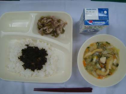 「豚肉の梅風味焼き 五目汁 のりのつくだ煮 ごはん 牛乳」