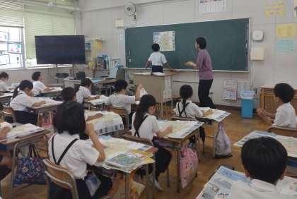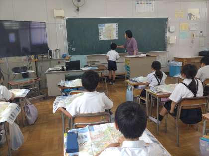 3年生の社会では、大阪市についての学習を進めています。今日は、大阪市にある施設や有名な場所などが何区にあるのか、地図を使って調べました。自分たちの通っている「西天満小学校」は『北区』、社会見学で行った「あべのハルカス」は『阿倍野区』など、地図の中から見つけて場所と区を確かめました。
