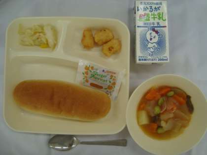「いかてんぷら フレッシュトマトのスープ煮 キャベツとコーンのサラダ コッぺパン アプリコットジャム 牛乳」