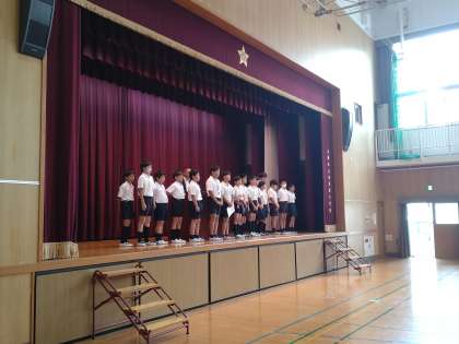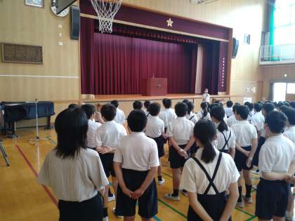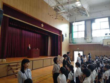 月曜日の全校朝会では、蒸し暑さにも負けない元気な「おはようございます」の声が体育館に響きました。また、6月16日に行われた「北区子ども会夏季ソフトボール大会」の表彰がありました。努力して掴んだ準優勝を、学校のみんなで拍手で讃えました。
