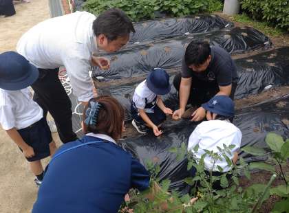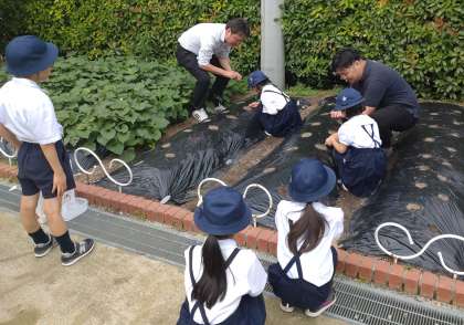 2年生の生活の時間です。和田萬商店さんをゲストティーチャーにお招きし、学習園にゴマの種をまきました。1週間ほどすると芽が出てくるそうです。おいしいごまが育つように、みんなでしっかりとお世話をがんばりましょう。
