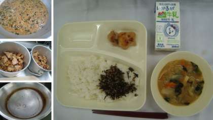 「鶏肉のてり焼き みそ汁 魚ひじきそぼろ ごはん 牛乳」