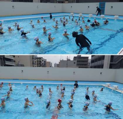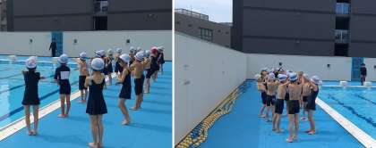 まず、プールサイドの並ぶ場所や、バディでの健康チェックの方法などを確かめました。