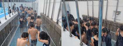 つぎに、入水前のシャワーです。水を浴びると思わず声が出ている子もいました。