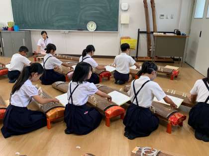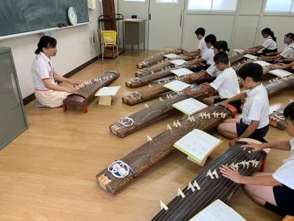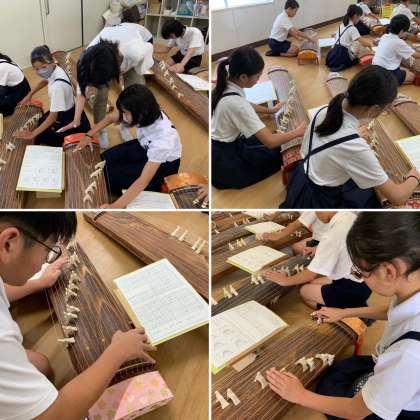 6年生の子どもたちが、お琴の学習で、初めの課題曲「さくら」に挑戦しています。学校中にお琴の音色が聞こえると、とても優雅な気持ちになります。