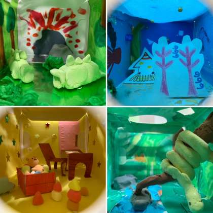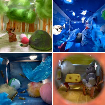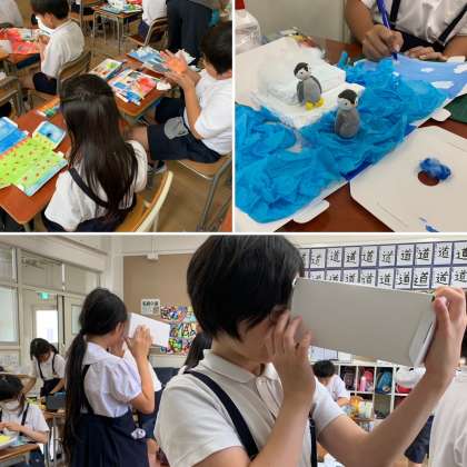 5年生の図画工作の時間です。「のぞいてみると」というテーマで、閉じられた箱の中をさまざまな世界をイメージして作成し、それを小さな穴から見て楽しみます。宇宙であったり、海中であったり、部屋の中であったりと、アイデアも豊富です。