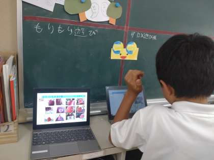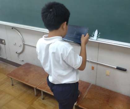 4年生の図画工作では、学校にある物をモチーフに、自分でオリジナルのマスコットキャラクターを考えています。できたマスコットを、教室のどこがぴったり合うか背景を考えて、カメラでパチリ。どんな風に撮れたのか、友達の作品を見るのも楽しみですね。