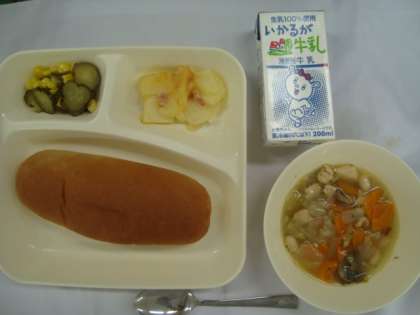 「鶏肉とてぼ豆のスープ煮 ベーコンとじゃがいものチーズ焼き きゅうりとコーンのサラダ 黒糖パン 牛乳」
