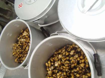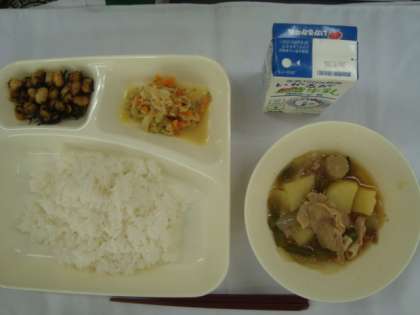 「豚肉とじゃがいもの煮もの ひじき豆 ささみと野菜のごまみそ焼き ごはん 牛乳」