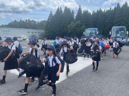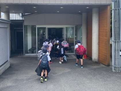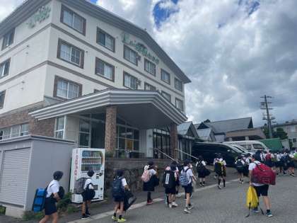 予定時刻通りに、子どもたちがお世話になる「パークホテル白樺館」に到着しました。今日から本校を含めて3つの小学校がお世話になる大きなホテルです。